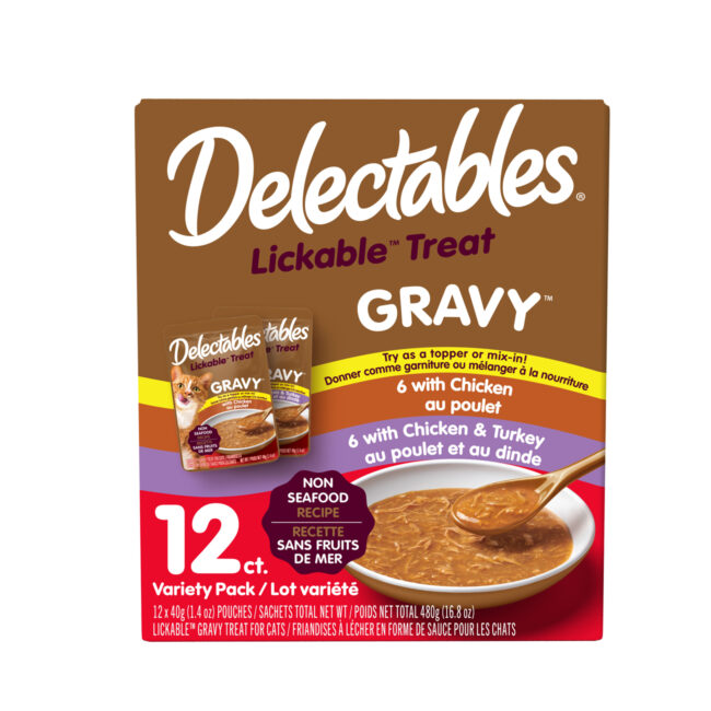 Delectables® Gravy Lickable™ treat has a unique wet texture that combines tender real chicken and turkey with a thick & hearty gravy without any seafood, even the most finicky cats will be begging for more!